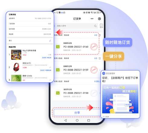 商品库存一键知晓,外出也能手机随时随地订货,订单一键分享功能,有效避免错单漏单,收货响应更及时,实现简单高效的采购配送流程。