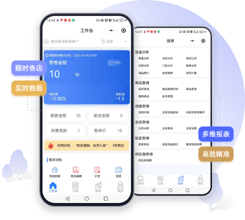 移动化店铺管理,实时监控销售额、客单数、会员数等核心指标,支持营业分析、收银查询、库存查询等多维数据报表一目了然。